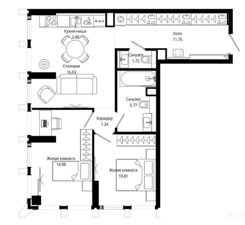 Планировка: Просторная 2-комнатная квартира в новостройке, готовая к ремонту.