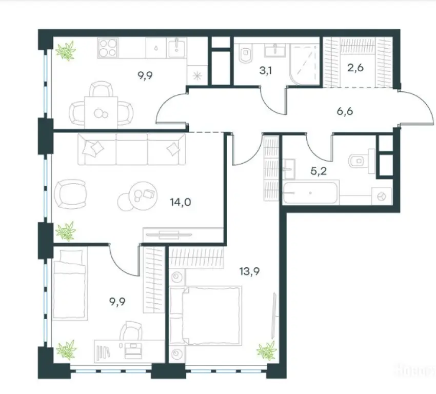 Площадь: 65.2 кв. м — идеальный метраж для создания уютного семейного гнезда или стильного пространства для себя.